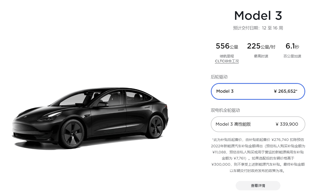 当前,特斯拉Model 3的后轮驱动版,补贴后价格为26.56万元;高性能版为33.99万元;