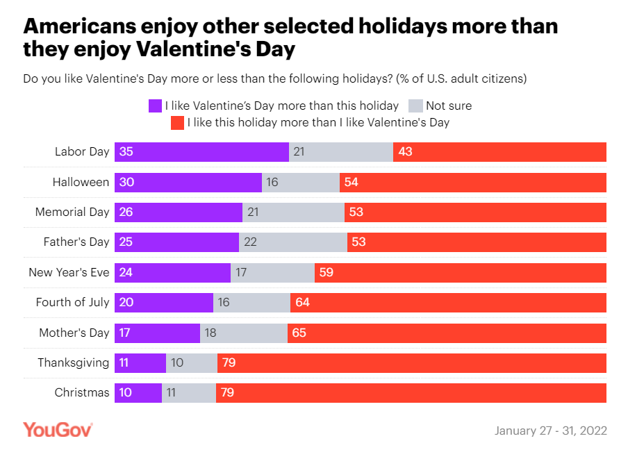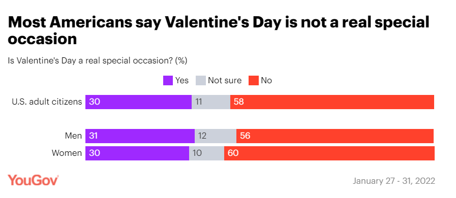 YouGov的一项民意调查发现,大多数美国成年公民(58%)并不认为情人节是一个特殊节日。有30%的美国人认为是。大致相同比例的男性(31%)和女性(30%)认为情人节是一个特殊的日子。