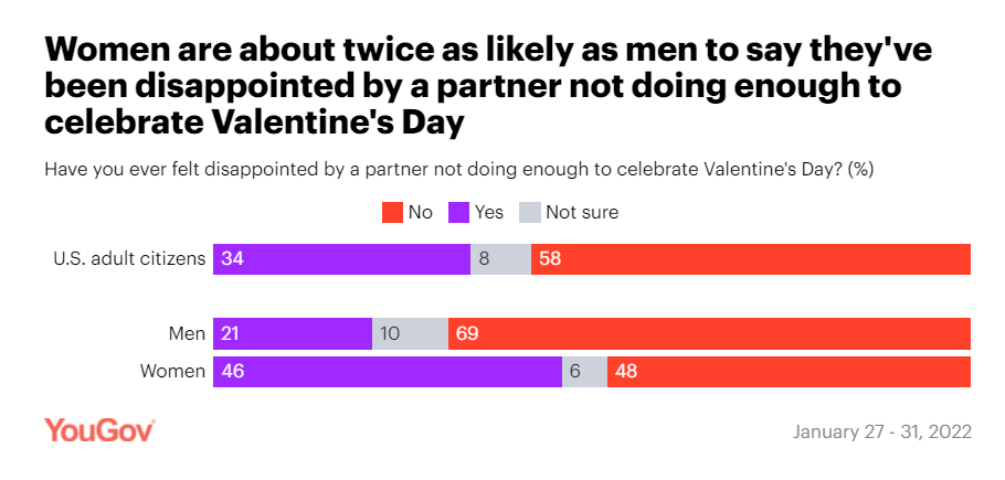 在那些曾经与伴侣一起庆祝过情人节的人中有34%对伴侣没有为庆祝节日的准备而感到失望。近一半曾与伴侣一起庆祝这一天的女性(46%)这么表示,但这么认为的男性只有一半(21%)。