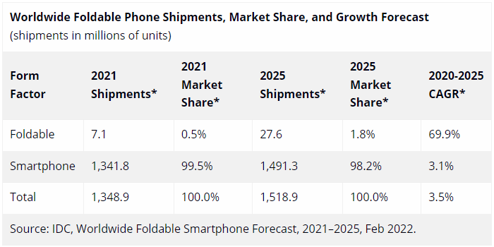 IDC 将快速增长的头功归于三星,该公司在去年 8 月发布了广受欢迎的 Galaxy Z Flip 3,且预计会在今年晚些时候发布 Galaxy Z Flip 4 / Z Fold 4 。