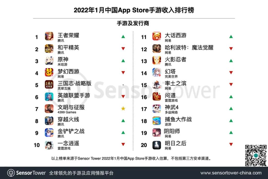 作为中国市场的长青游戏之一,《问道》手游于1月7日开启新年大服后,游戏收入增长70%,发行商雷霆游戏排名前进3位至第11名。