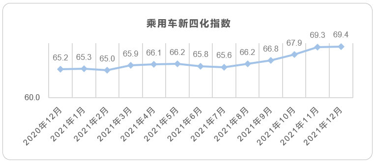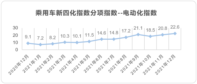 2021年12月整体市场销量达销量为210.5万辆,同比下降7.9%,较2019年12月下降1.9%。新四化整体经历11月的快速提升后,基本与上月持平;其中电动化指数较其他指数仍有较快的增速。