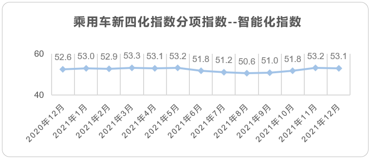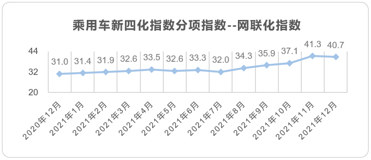 2021年12月新四化整体指数基本与上月持平,电动化仍保持较快增速。电动化指数经历10月的震荡后,目前仍持续上扬。纵观2021年电动化发展趋势,我们不难发现从2021年下半年开始,新能源市场持续发力,电动化指数迅猛提升。从数据表现来看,新能源车对燃油车市场的部分替代效应,通过用户的市场化选择证明了消费需求的变化,并拉动车市加速向新能源化转型的步伐。而智能化指数、网联化指数正如预测的那样,11月攀升后数值有所回落。但网联化装备的标配趋势仍将是2022年不变的信号。