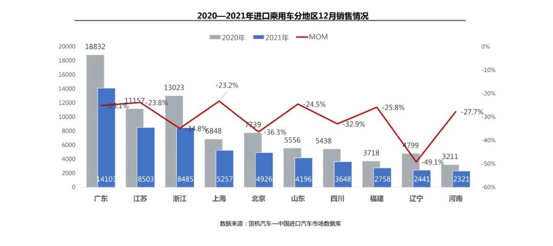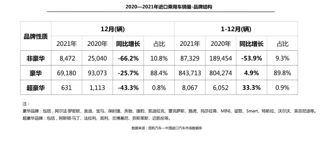 12 月,在去年同期的高基数和供给不足影响下,非豪华品牌、豪华品牌和超豪华品牌销量分别同比下滑 66.2%、25.7% 和 43.3%。1-12 月,豪华品牌仍是绝对销售主力,占销售总量的 89.8%;非豪华品牌降幅进一步扩大至 53.9%,豪华品牌、超豪华品牌呈现 4.9% 和 33.3% 的同比增长。