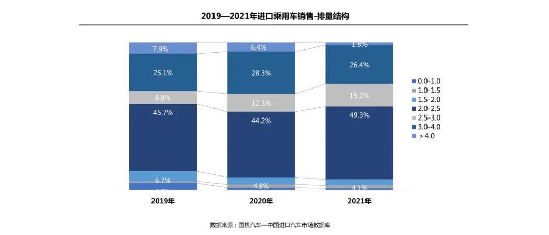 1-12 月,2.0-2.5L 以 49.3% 的份额依然占据第一排量区间,在奔驰 GLE、宝马 2 系、奥迪 A5 和 Q7 等车型销量增长带动下,份额较 2020 年提升 5.1 个百分点;2.5-3.0L 份额提升 2.9 个百分点;3.0L 以上车型份额明显下降。