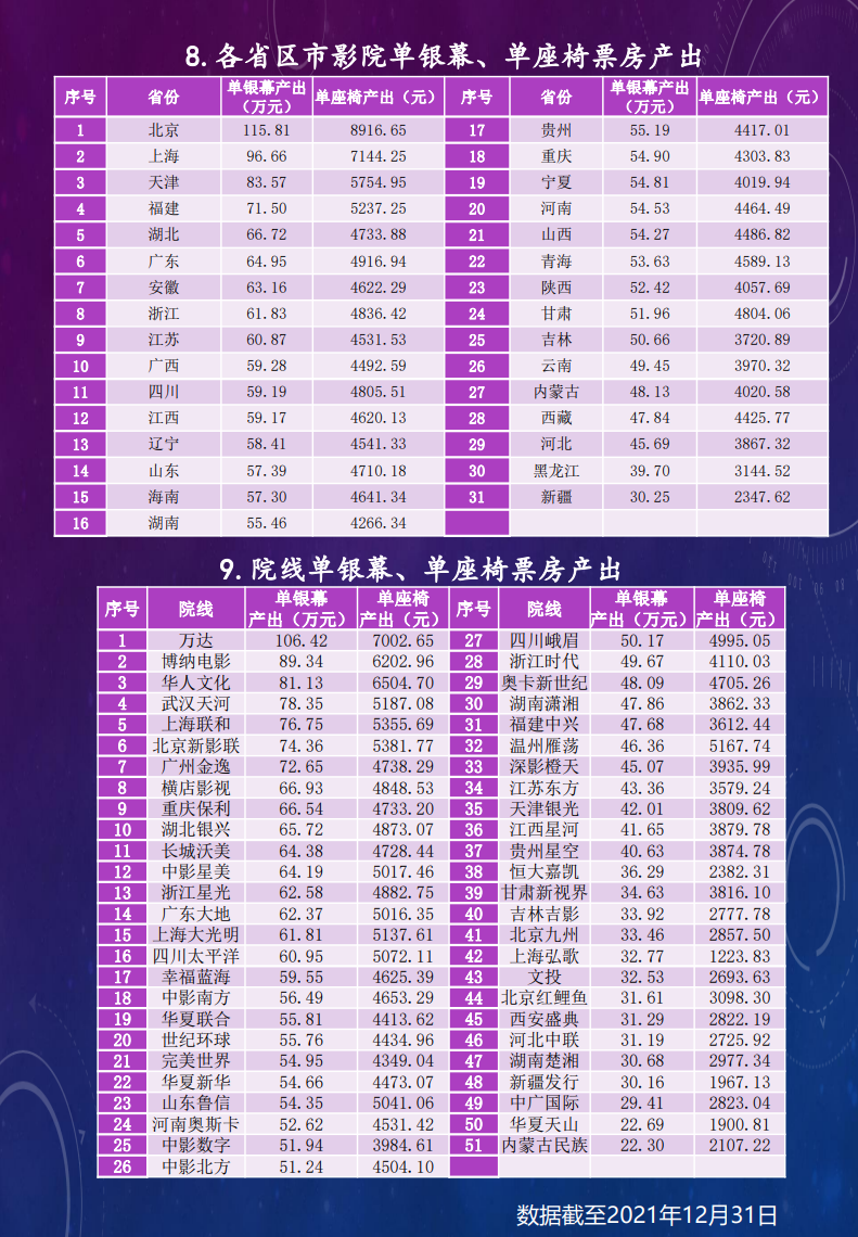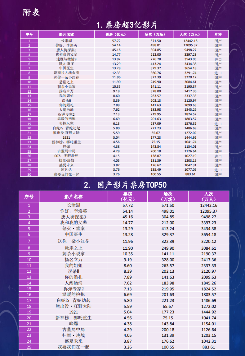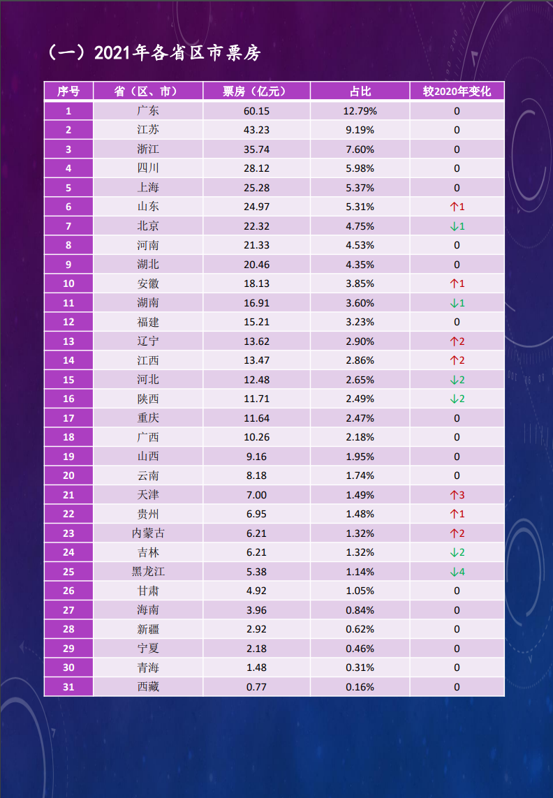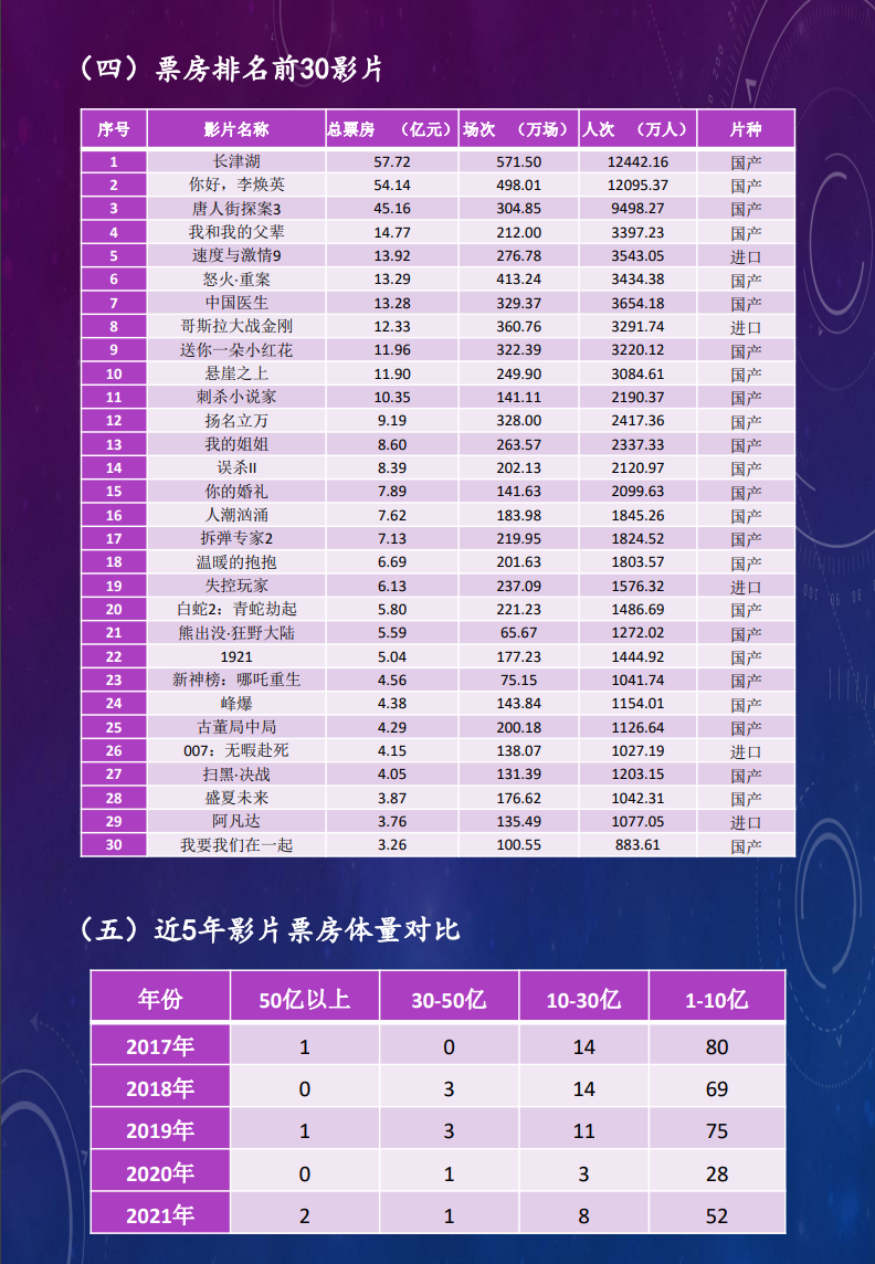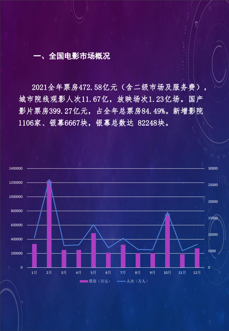 电资办:2021年度中国电影市场数据报告 更多阅读:电资办:2023年3月全国电影票房月报电资办:2022年4月全国电影票房月报电资办:2023年5月全国电影月报电资办:2022年9月19-25日全国电影票房周报电资办:2016年Q1全国电影票房季报电资办:2016年01月11-17日全国电影票房周报电资办:2016年2月全国电影票房月报电资办:2016年1-6月全国电影票房245.82亿元 观影人次7.23亿人电资办:2019年9月16-22日全国电影票房周报电资办:2019年9月23-29日全国电影票房周报电资办:2019年11月4-10日全国电影票房周报电资办:2019年10月28日-11月3日全国电影票房周报电资办:2019年10月21-27日全国电影票房周报电资办:2019年9月30日-10日6日全国电影票房周报电资办:2019年3月18-24日全国电影票房周报