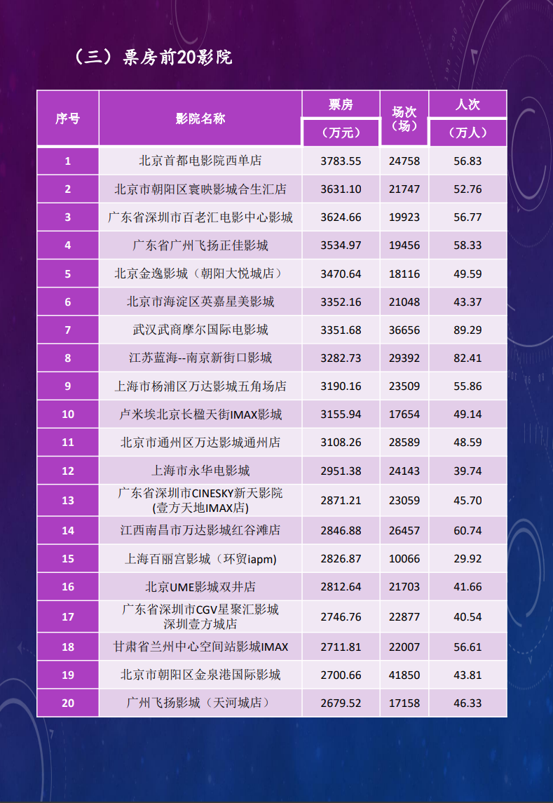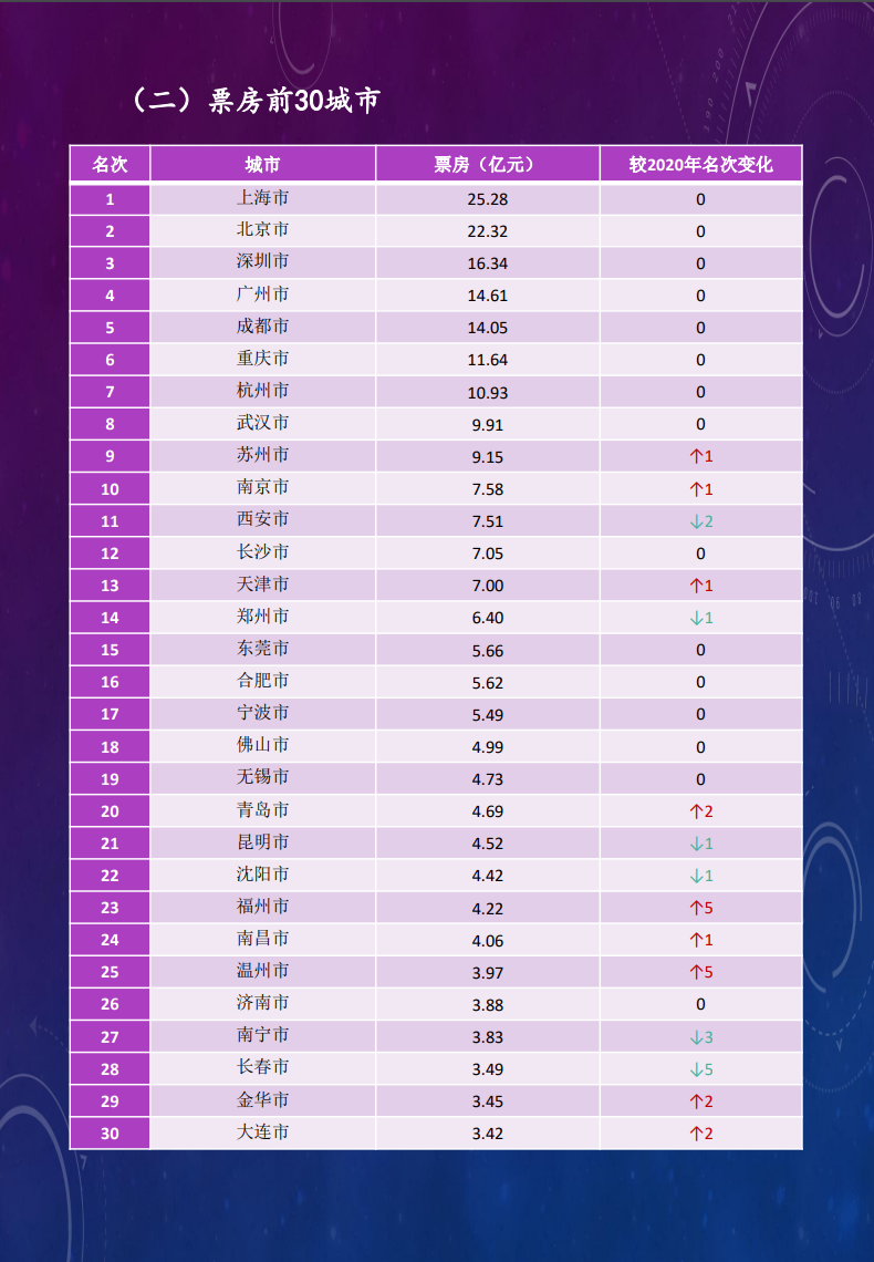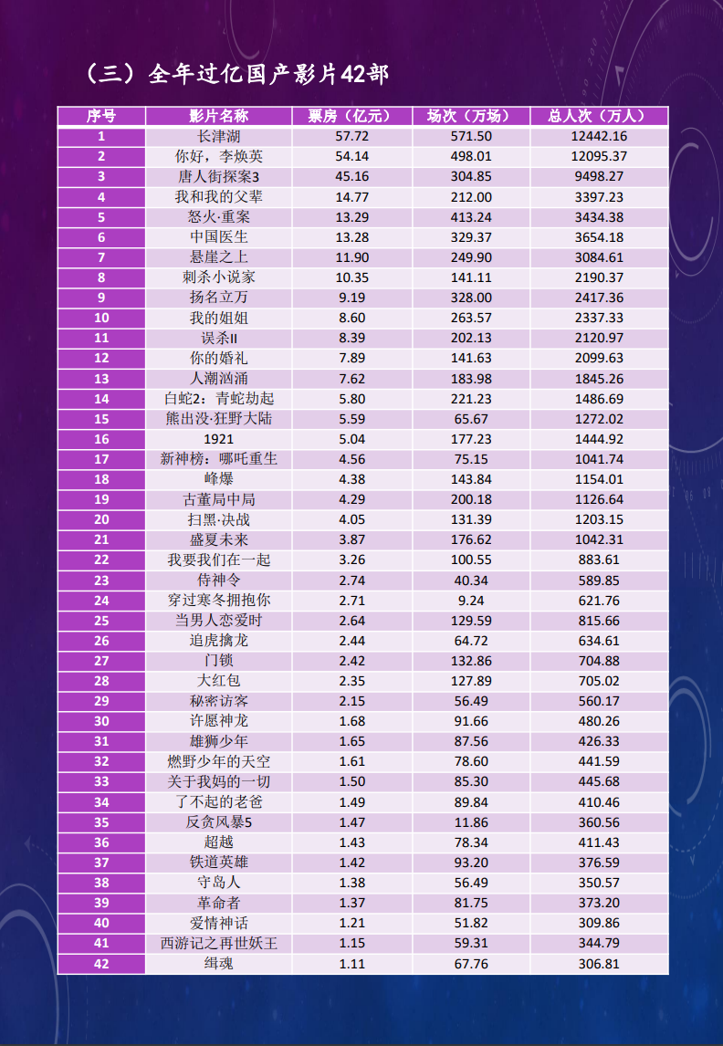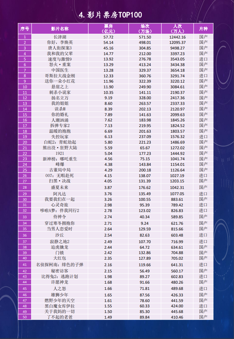 电资办:2021年度中国电影市场数据报告 更多阅读:电资办:2023年3月全国电影票房月报电资办:2022年4月全国电影票房月报电资办:2023年5月全国电影月报电资办:2022年9月19-25日全国电影票房周报电资办:2016年Q1全国电影票房季报电资办:2016年01月11-17日全国电影票房周报电资办:2016年2月全国电影票房月报电资办:2016年1-6月全国电影票房245.82亿元 观影人次7.23亿人电资办:2019年9月16-22日全国电影票房周报电资办:2019年9月23-29日全国电影票房周报电资办:2019年11月4-10日全国电影票房周报电资办:2019年10月28日-11月3日全国电影票房周报电资办:2019年10月21-27日全国电影票房周报电资办:2019年9月30日-10日6日全国电影票房周报电资办:2019年3月18-24日全国电影票房周报