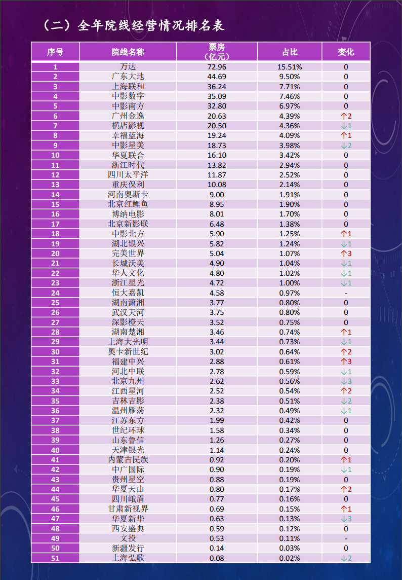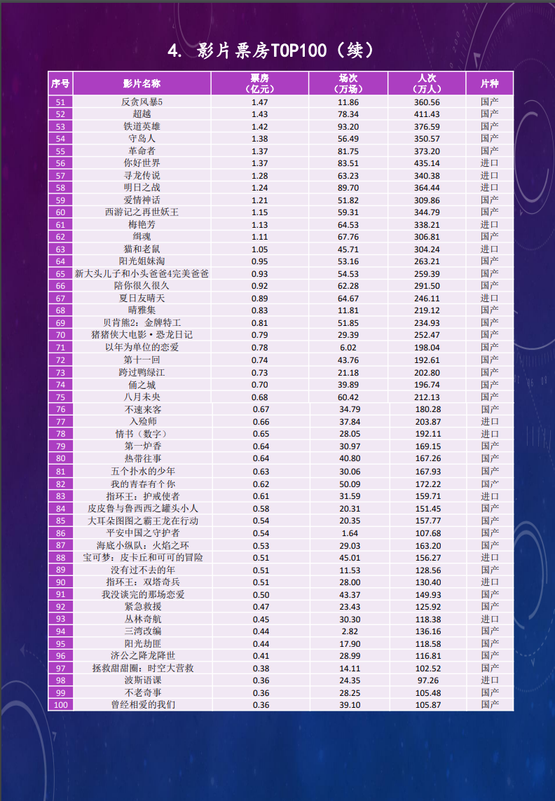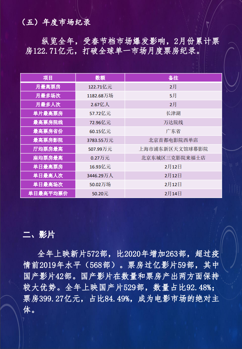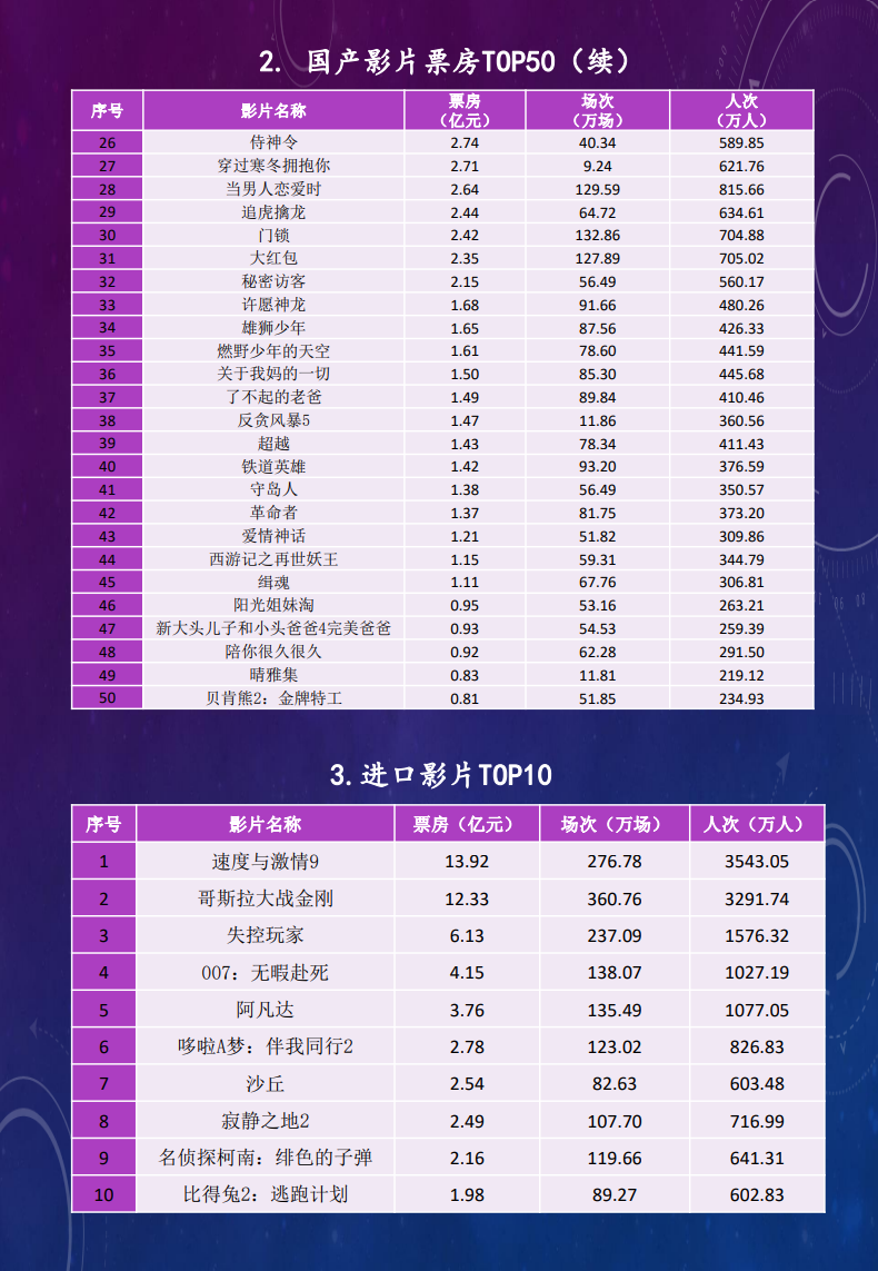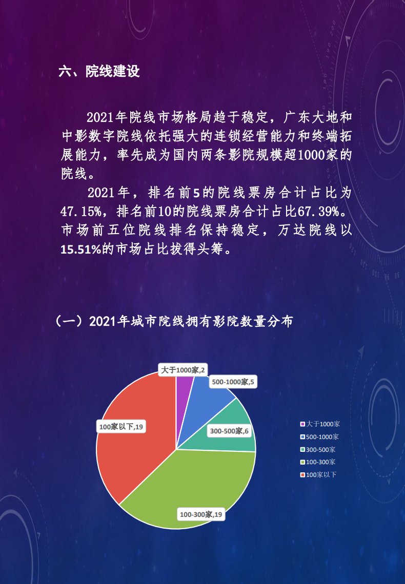 电资办:2021年度中国电影市场数据报告 更多阅读:电资办:2023年3月全国电影票房月报电资办:2022年4月全国电影票房月报电资办:2023年5月全国电影月报电资办:2022年9月19-25日全国电影票房周报电资办:2016年Q1全国电影票房季报电资办:2016年01月11-17日全国电影票房周报电资办:2016年2月全国电影票房月报电资办:2016年1-6月全国电影票房245.82亿元 观影人次7.23亿人电资办:2019年9月16-22日全国电影票房周报电资办:2019年9月23-29日全国电影票房周报电资办:2019年11月4-10日全国电影票房周报电资办:2019年10月28日-11月3日全国电影票房周报电资办:2019年10月21-27日全国电影票房周报电资办:2019年9月30日-10日6日全国电影票房周报电资办:2019年3月18-24日全国电影票房周报