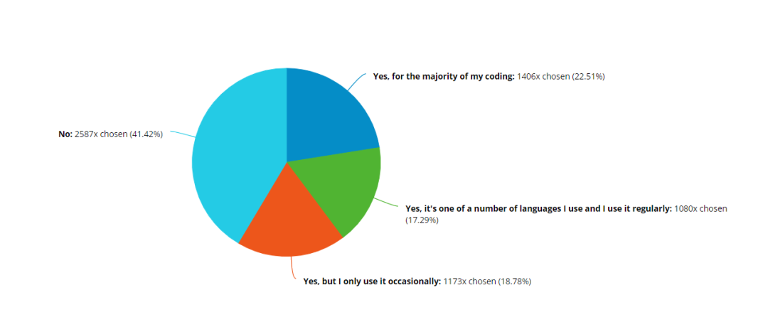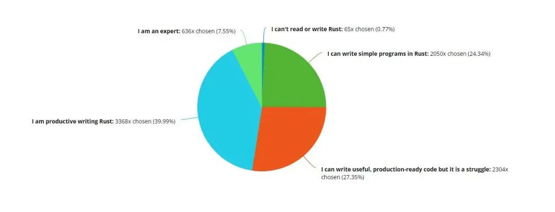 现在,人们已经将 Rust 视为能够安全运用于专业环境下的强大语言。在使用 Rust 的受访者中,有 59% 偶尔会在实际工作中使用,有 23% 会在大部分编码中都使用 Rust。相比之下,去年只有 42% 的受访者会在工作中实际使用 Rust。