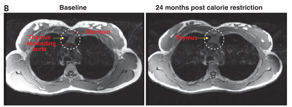 在热量限制试验结束后,研究人员发现 “八分饱” 的试验组参与者胸腺体积与两年前相比明显增大、新生 T 细胞数量增多,而对照组参与者胸腺体积、功能几乎没有变化。