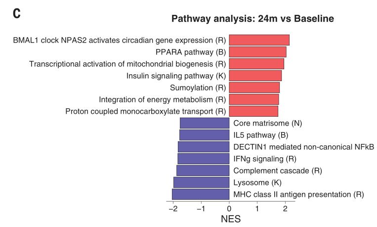 果然,热量限制确实改变了脂肪组织的基因表达,这些基因主要与线粒体生物合成、抗炎反应以及胰岛素信号等通路相关,而这些通路在寿命延长中发挥作用。