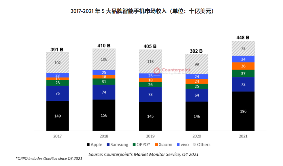 2月26日消息,Counterpoint research发布的最新数据报告显示,2021年全球智能手机市场收入超过4480亿美元,同比增长7%,环比增长20%,创下历史新高。数据显示,2021年全球智能手机收入品牌前五分别为: