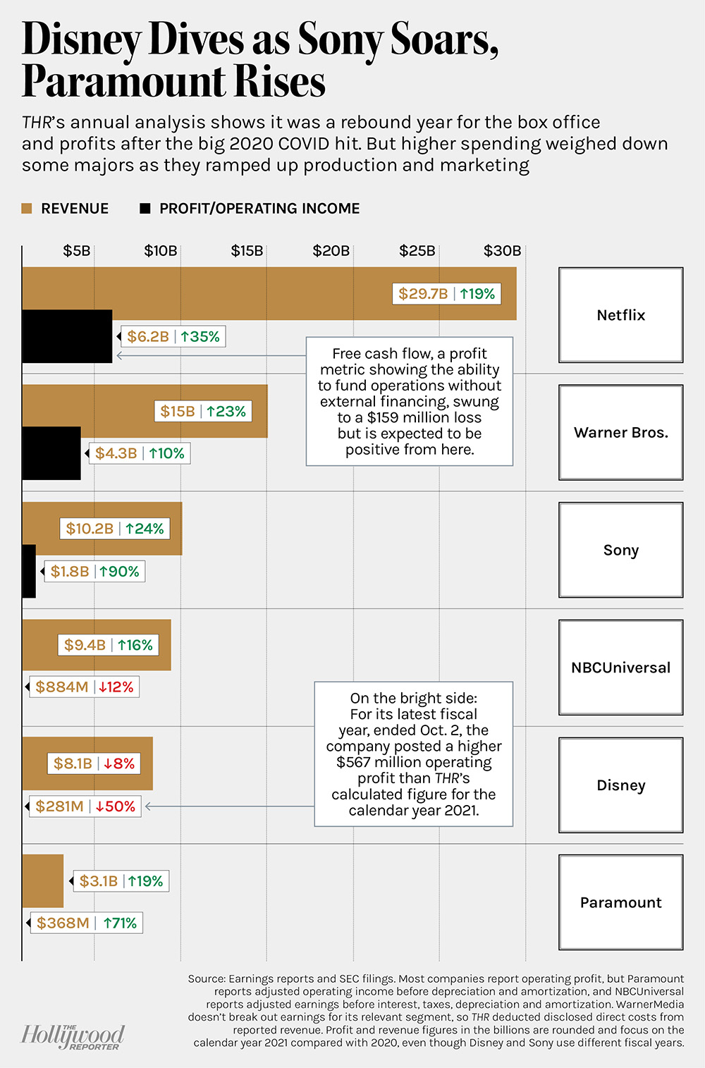 据外媒好莱坞报道者报道,去年好莱坞电影公司利润排名中,Netflix最高,华纳第二,索尼和派拉蒙都有大幅上升,迪士尼则有利润跳水情况。