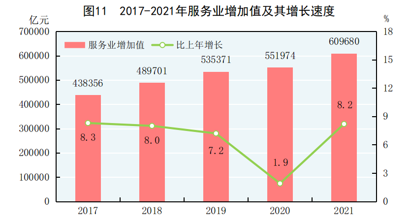 [17] 战略性新兴服务业包括新一代信息技术产业、高端装备制造产业、新材料产业、生物产业、新能源汽车产业、新能源产业、节能环保产业和数字创意产业等八大产业中的服务业相关行业,以及新技术与创新创业等相关服务业。2021 年战略性新兴服务业企业营业收入增速按可比口径计算。