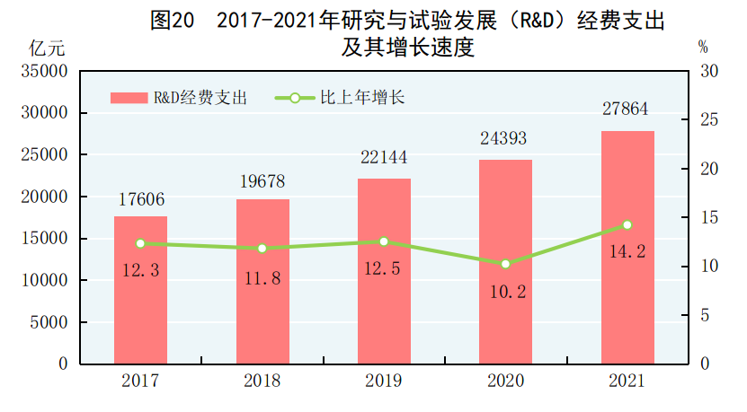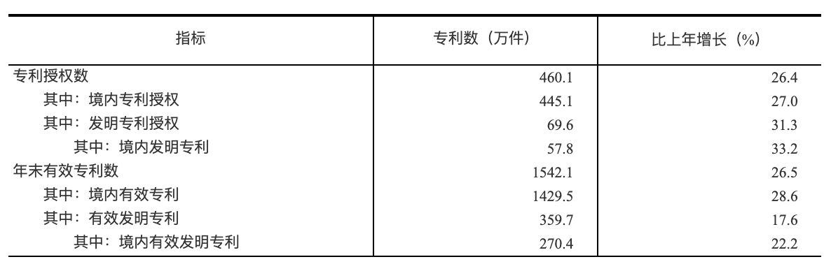 全年研究与试验发展(R&D)经费支出27864亿元,比上年增长14.2%,与国内生产总值之比为2.44%,其中基础研究经费1696亿元。国家自然科学基金共资助4.87万个项目。截至年末,正在运行的国家重点实验室533个,纳入新序列管理的国家工程研究中心191个,国家企业技术中心1636家,大众创业万众创新示范基地212家。国家科技成果转化引导基金累计设立36支子基金,资金总规模624亿元。国家级科技企业孵化器[60]1287家,国家备案众创空间[61]2551家。全年授予专利权460.1万件,比上年增长26.4%;PCT专利申请受理量[62]7.3万件。截至年末,有效专利1542.1万件,其中境内有效发明专利270.4万件。每万人口高价值发明专利拥有量[63]7.5件。全年商标注册773.9万件,比上年增长34.3%。全年共签订技术合同67万项,技术合同成交金额37294亿元,比上年增长32.0%。