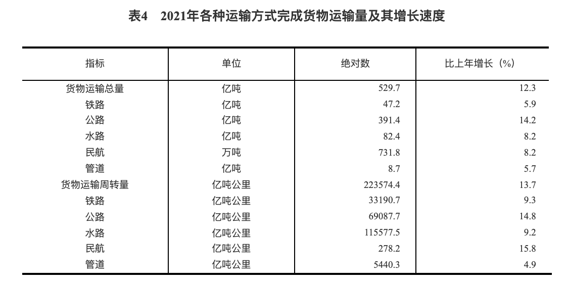 [29] 货物运输总量及周转量包括铁路、公路、水路、民航和管道五种运输方式完成量,2021 年增速按可比口径计算。
