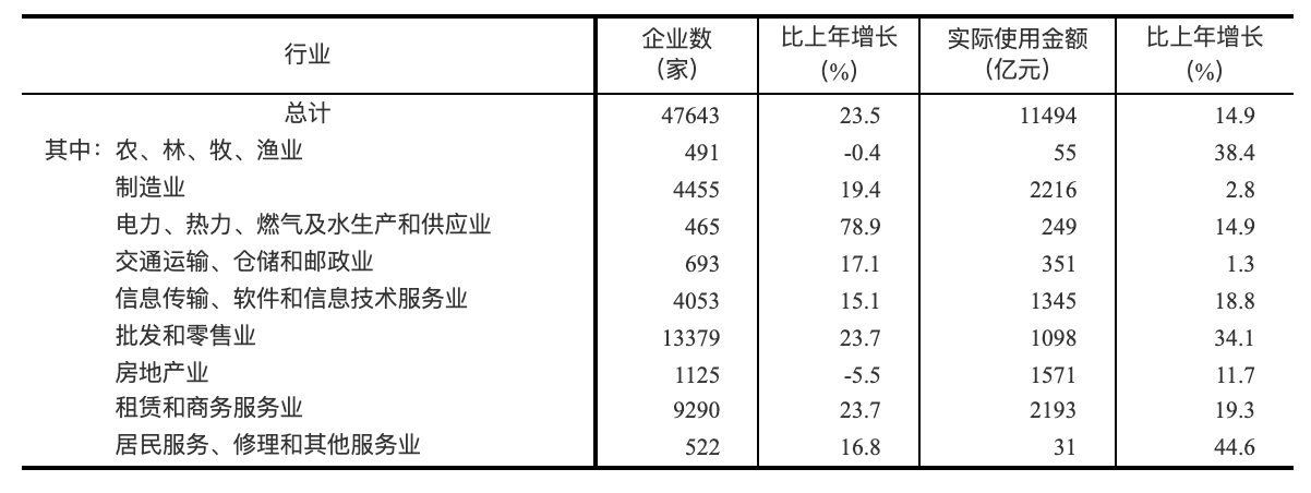 全年外商直接投资(不含银行、证券、保险领域)新设立企业47643家,比上年增长23.5%。实际使用外商直接投资金额11494亿元,增长14.9%,折1735亿美元,增长20.2%。其中 “一带一路” 沿线国家对华直接投资(含通过部分自由港对华投资)新设立企业5336家,增长24.3%;对华直接投资金额743亿元,增长29.4%,折112亿美元,增长36.0%。全年高技术产业实际使用外资3469亿元,增长17.1%,折522亿美元,增长22.1%。