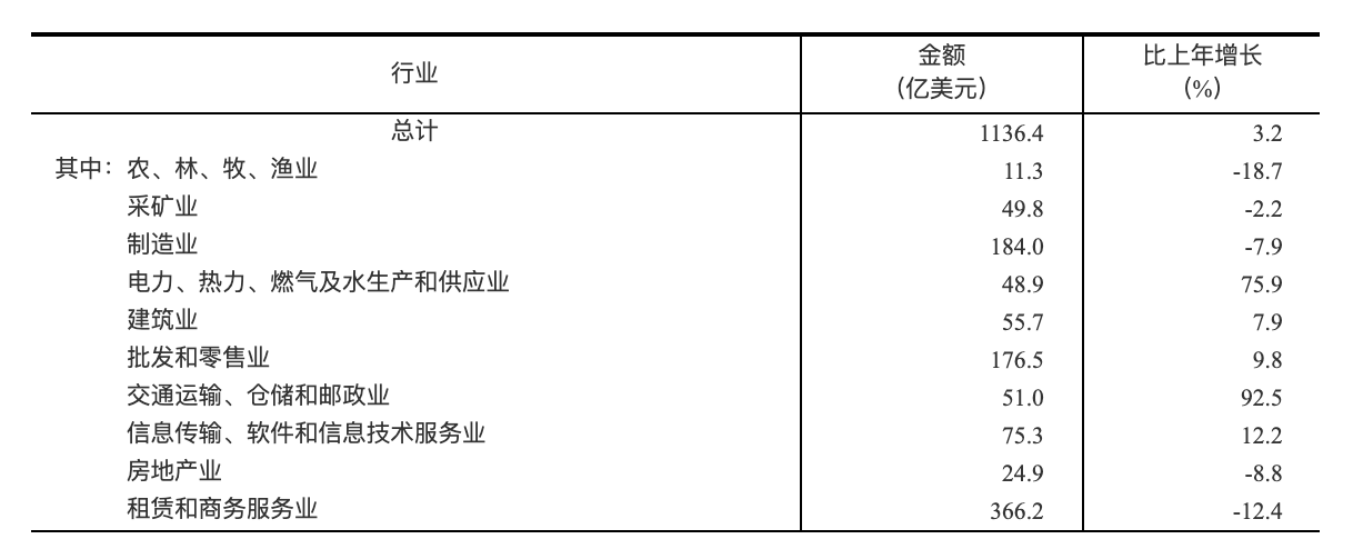 全年对外非金融类直接投资额7332亿元,比上年下降3.5%,折1136亿美元,增长3.2%。其中,对“一带一路”沿线国家非金融类直接投资额203亿美元,增长14.1%。