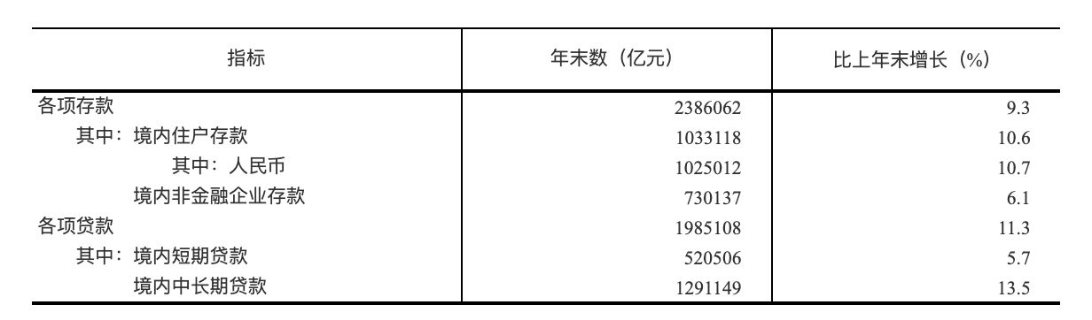 全年社会融资规模增量[45]31.4万亿元,按可比口径计算,比上年少3.4万亿元。年末社会融资规模存量[46]314.1万亿元,按可比口径计算,比上年末增长10.3%,其中对实体经济发放的人民币贷款余额191.5万亿元,增长11.6%。年末全部金融机构本外币各项存款余额238.6万亿元,比年初增加20.2万亿元,其中人民币各项存款余额232.3万亿元,增加19.7万亿元。全部金融机构本外币各项贷款余额198.5万亿元,增加20.1万亿元,其中人民币各项贷款余额192.7万亿元,增加19.9万亿元。人民币普惠金融贷款[47]余额26.5万亿元,增加5.0万亿元。