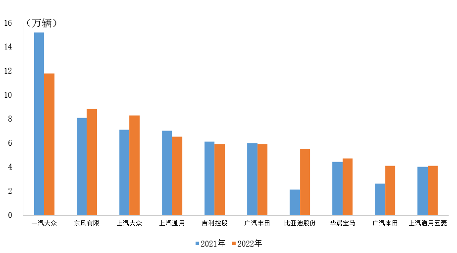 中国汽车工业协会:2022年1月前十位轿车生产企业销售情况简析 据中国汽车工业协会统计分析,2022年1月,销量排名前十位的轿车生产企业共销售65.6万辆,占轿车销售总量的64.5%。 在销量排名前十位的轿车生产企业中,与上月相比,华晨宝马、东风有限(本部)和广汽本田销量呈较快增长,上汽大众与上月持平,其他企业均呈下降,其中上汽通用和上汽通用五菱降幅更为明显;与上年同期相比,一汽大众销量呈较快下降,上汽通用、吉利控股和广汽丰田降幅略低,其他企业均呈增长,其中比亚迪股份和广汽本田增速更为显著。 更多阅读:中国汽车工业协会:2023年1-8月前十位轿车生产企业销售情况简析中国汽车工业协会:2022年3月前十位轿车品牌销量排名中国汽车工业协会:2023年1-2月我国汽车商品出口金额前十国情况简析中国汽车工业协会:2021年5月汽车工业运行情况简述中汽协:2024年1-5月前十位轿车生产企业销售情况简析中国汽车工业协会:2023年1-7月乘用车分级别销售情况简析中国汽车工业协会:2023年1-7月汽车制造业营业收入保持增长中国汽车工业协会:2023年1-7月汽车制造业工业增加值保持较快增长中国汽车工业协会:2023年1-7月前十位汽车生产企业销售情况简析中国汽车工业协会:2023年1-8月汽车制造业工业增加值保持较快增长中国汽车工业协会:2023年5月我国汽车整车出口情况简析中国汽车工业协会:2023年上半年汽车制造业固定资产投资保持较快增长中国汽车工业协会:2023年1-8月前十位SUV生产企业销售情况简析中国汽车工业协会:2023年上半年前十位汽车生产企业销售情况简析中国汽车工业协会:2023年上半年汽车制造业工业增加值继续保持两位数增长