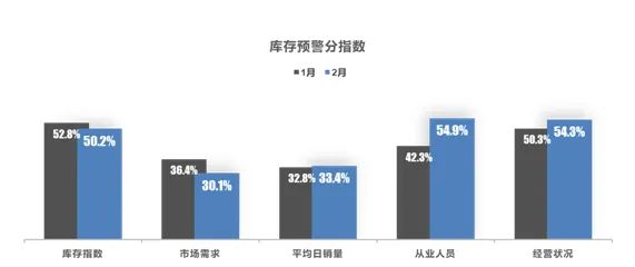 从分指数情况看:2 月库存、市场需求指数下降,平均日销量、从业人员指数、经营状况指数环比上升。