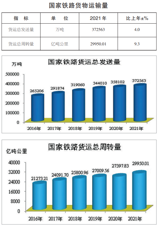 国家铁路机车拥有量为 2.09 万台。其中,内燃机车 0.74 万台,占 35.4%;电力机车 1.35 万台,占 64.6%。国家铁路客车拥有量为 7.6 万辆,其中,动车组 4012 标准组、32097 辆。国家铁路货车拥有量为 89.2 万辆。