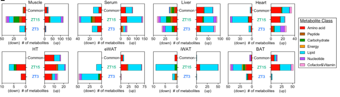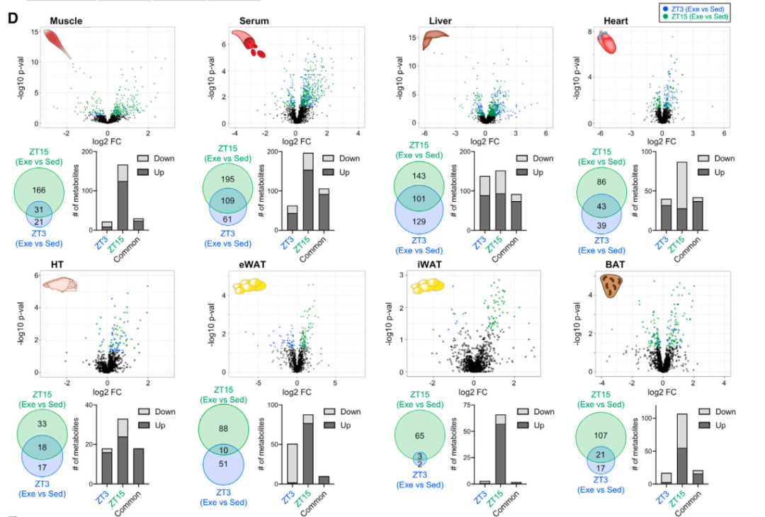 对于肌肉组织来说,清晨运动改变了 197 个代谢物的水平,而傍晚的运动仅影响了 52 个代谢物的水平;在肝脏中,清晨和傍晚运动分别影响了 129 和 143 个代谢物的水平;更有意思的是,在清晨运动主要使 eWAT 中代谢物水平降低,但在傍晚运动时这些代谢物水平却是在增加。(图 2)