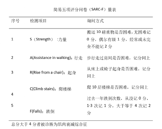 还可以通过简易五项评分问卷(SARC-F)量表进行自评,总分>4 分的中老年人,就需要到医院去进行进一步的检查了。