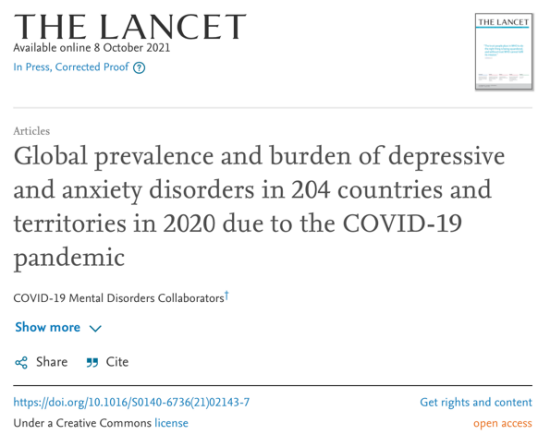 1. COVID-19 Mental Disorders Collaborators. Global prevalence and burden of depressive and anxiety disorders in 204 countries and territories in 2020 due to the COVID-19 pandemic [published online ahead of print, 2021 Oct 8]. Lancet. 2021;S0140-6736(21)02143-7. doi:10.1016/S0140-6736(21)02143-7