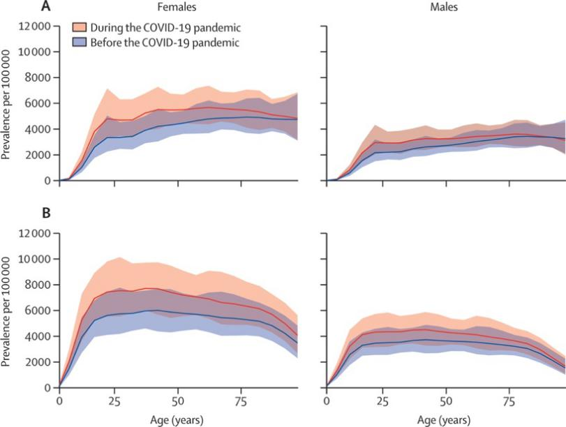 图 1 疫情发生前后的全球抑郁症 (A) 和焦虑症 (B) 发病率对比(年龄与性别分析)