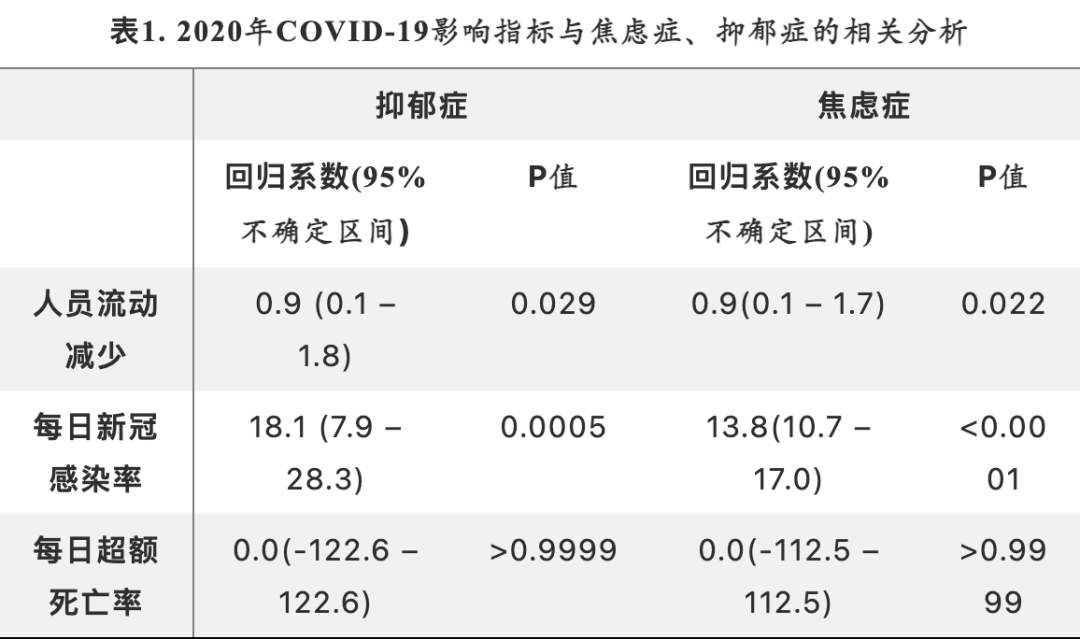 也就是说,新冠感染率增加、人员流动减少,可能会导致焦虑症和抑郁症增加,而超额死亡率则与此无关。
