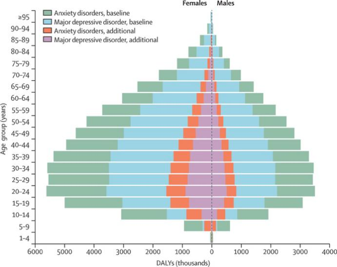 图 2:由抑郁症和焦虑症导致的 DALYs 增加(性别和年龄)