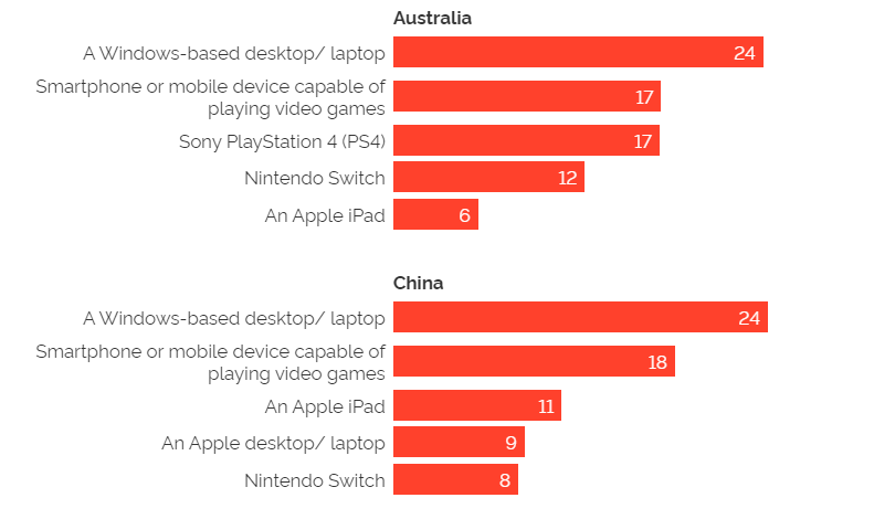 个人电脑和智能手机仍然是全球市场上最受欢迎的游戏设备。在专用游戏机方面,任天堂Switch 和索尼PS4 对头把交椅的争夺非常激烈。PC(笔记本电脑或台式机)在澳大利亚和中国玩家中最受欢迎,1/4的游戏玩家(24%)在基于 Windows 的PC上玩视频游戏。YouGov将游戏玩家被定义为每周至少玩30 分钟电子游戏的人。