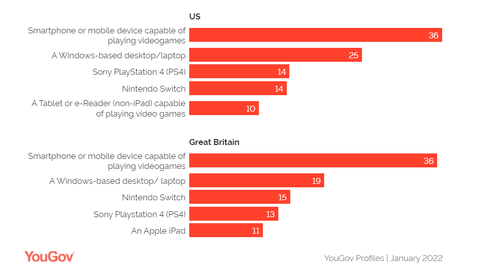 另一方面,手机是美国人和英国人最常用的游戏设备,36%的游戏玩家使用手机。相当大一部分美国玩家(25%)也用基于 Windows 的PC玩游戏,但在英国游戏玩家中的受欢迎程度有所下降(20%)。