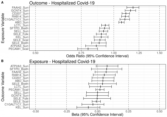 这就是遗传学可以发挥作用的地方。孟德尔随机化是一种比较风险因素和健康结果之间因果关系的方法,使用大型基因数据集可以评估与暴露(在这种情况下,个别血液蛋白水平高)有关的遗传变异和与疾病结果(在这种情况下,COVID-19重症)有关的遗传变异之间的关系。