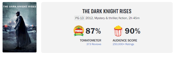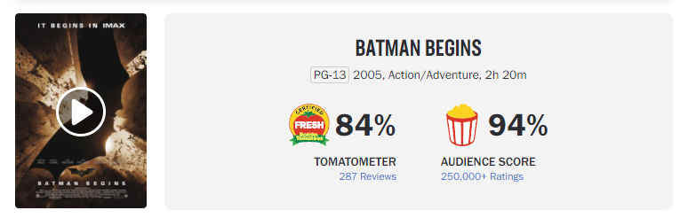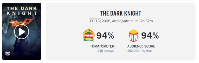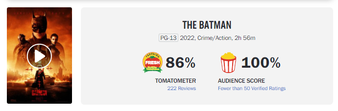 电影《新蝙蝠侠》今日在烂番茄网站的爆米花观众指数已开,截至发稿前,观众爆米指数100%。《新蝙蝠侠》的烂番茄新鲜度为86%,得到了官方的新鲜认证。
