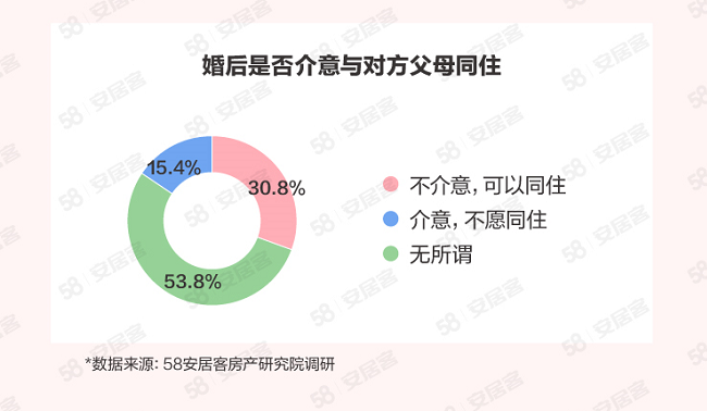 58 同城、安居客《2022 年女性置业调查报告》显示,有 53.8% 的女性表示婚后不愿意与对方父母同住,这一占比与往年相比有所增加。从年龄段来看,30 岁以下的年轻女性不愿意与公婆同住的占比高于其他年龄段,年轻女性更希望拥有自己的自由空间。