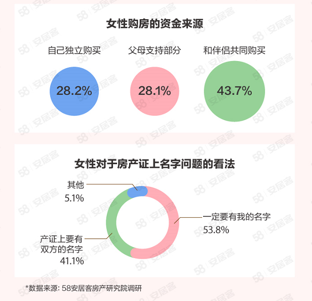 在女性购房资金来源方面,58 同城、安居客《2022 年女性置业调查报告》显示,购房时能自己独立买房的女性占比 28.2%,与 2021 年相比有明显提升,占比增加 9.2 个百分点;近半数女性选择和伴侣共同出资购房。对于房产证署名的看法,多数女性坚定认为要有自己的名字,53.8% 参与调研的女性选择此项。