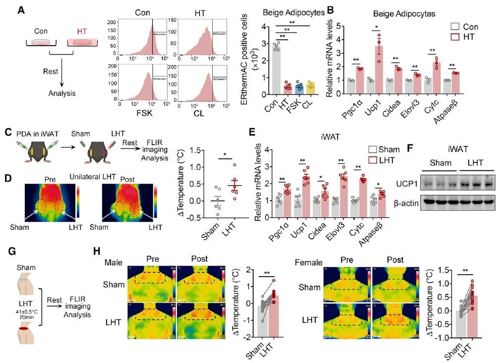 此外,他们还对人锁骨处的米色脂肪组织进行了局部热疗。结果发现,局部热疗能促进小鼠和人体米色脂肪细胞中产热和棕色脂肪基因的表达,同时不会引起应激激素水平的变化。研究人员还发现,局部热疗可能通过激活肥胖小鼠的米色脂肪,从而缓解、减轻肥胖小鼠体重,并治疗与肥胖相关的代谢疾病。