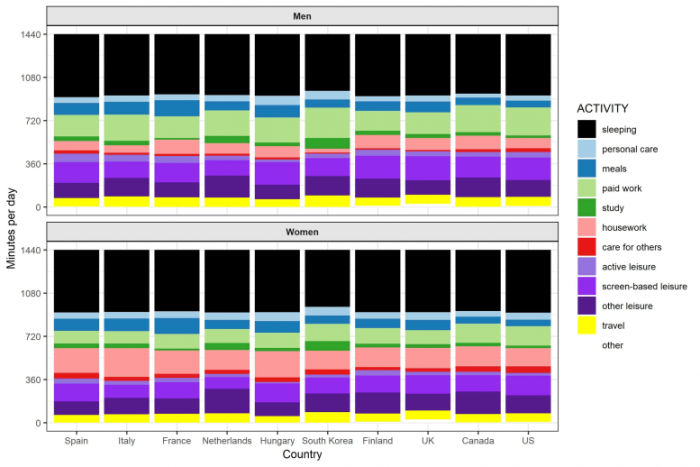 统计分析发现,在所有10个国家中,男性和女性在时间使用方面的最大差异是在家务劳动、护理工作和就业活动领域。韩国、匈牙利、意大利和西班牙的差距最大,而其他西欧国家的差距适中,芬兰和盎格鲁-撒克逊国家,如英国、美国和加拿大的差距最小。