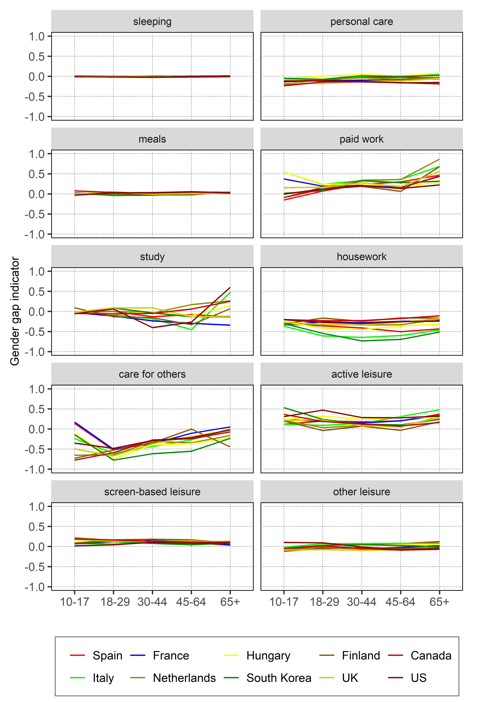 在所有10个国家中,花在家务和护理工作上的时间的性别差距从青春期到成年都在扩大,最大的差距从30岁到44岁持续存在,但在65岁以后缩小了。这种模式在意大利和韩国最为明显,而在加拿大和芬兰则不太明显。从30岁到64岁,用于就业活动的时间差距最大;这种模式在荷兰最明显,在美国不太突出。