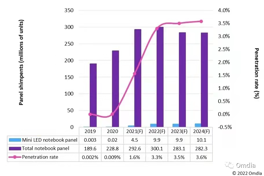 Omdia预测,2022年的笔电面板出货量为3亿片,mini LED笔电面板出货量预计为990万片,渗透率为3%,达到单位出货量和市场份额的又一个高峰。2022年,更多的Mini LED笔电面板项目将被规划,以加强PC市场需求,因为预计PC市场将出现需求衰退,特别是主流机型。因此,高端笔电面板型号将成为今年面板厂商和PC品牌之间的一个关键战略趋势。