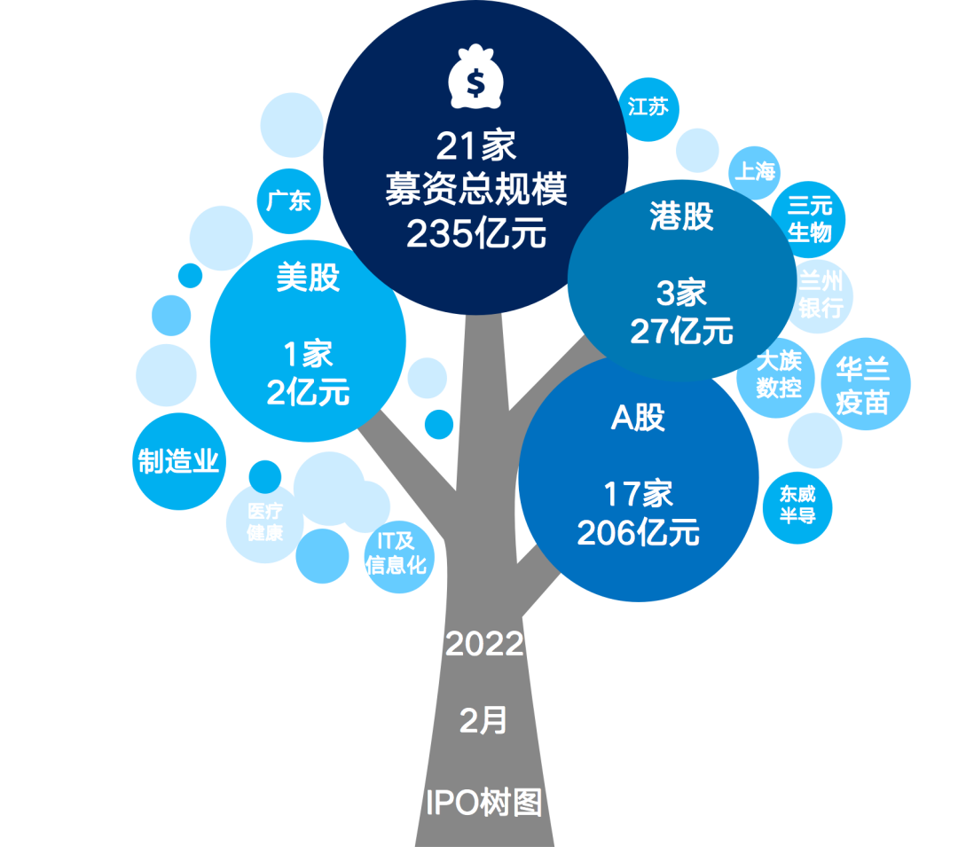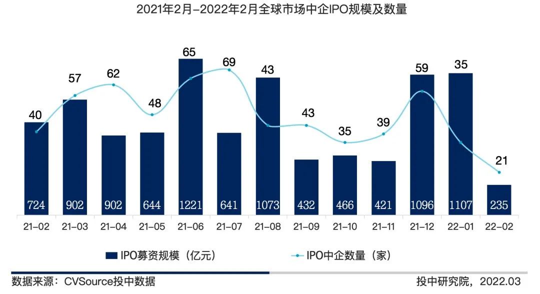 - 2022 年 2 月,共计 21 家中国企业在 A 股、港股以及美股成功 IPO,全球市场 IPO 数量规模均有所回落