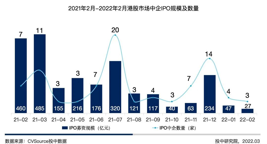 图 4 2021 年 2 月 – 2022 年 2 月港股市场中企 IPO 规模及数量