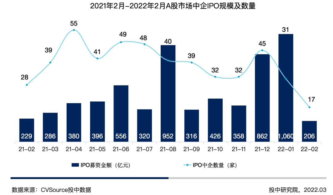 图 3 2021 年 2 月 – 2022 年 2 月 A 股市场中企 IPO 规模及数量