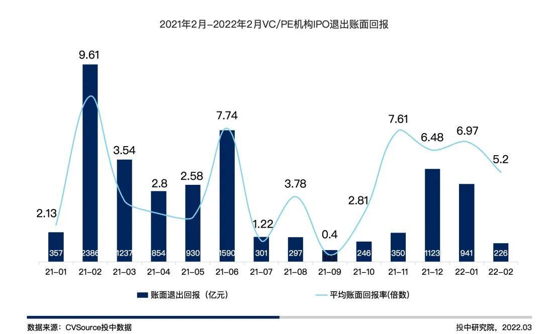 图 6 2021 年 2 月 – 2022 年 2 月 VC/PE 机构 IPO 退出账面回报