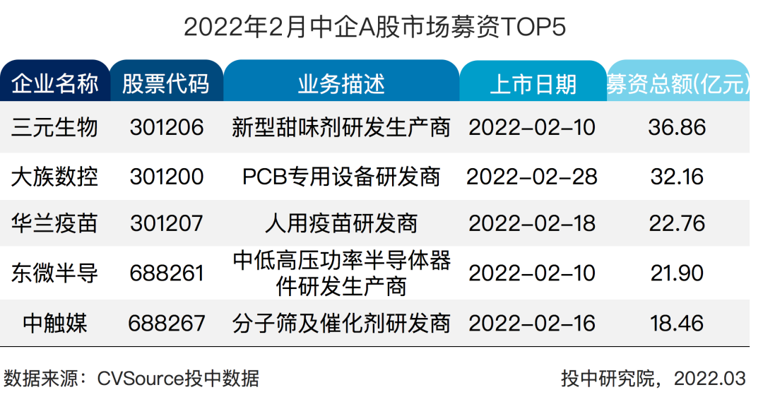 表 2 2022 年 2 月中企 A 股市场募资 TOP5