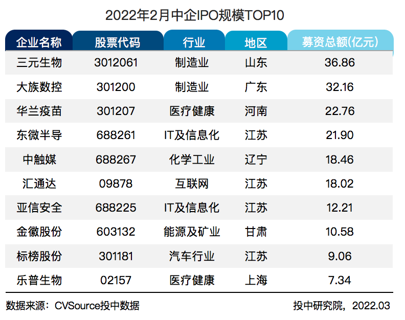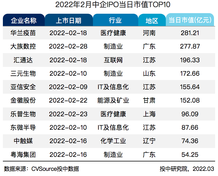 - 募资规模前十大 IPO 项目均在 7 亿元以上,占 2 月整体募资 80.51%。华兰疫苗当日市值近 281.21 亿元,位居榜首