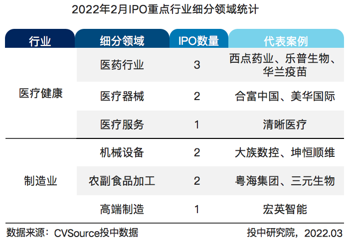 表 6 2022 年 2 月 IPO 重点行业细分领域统计