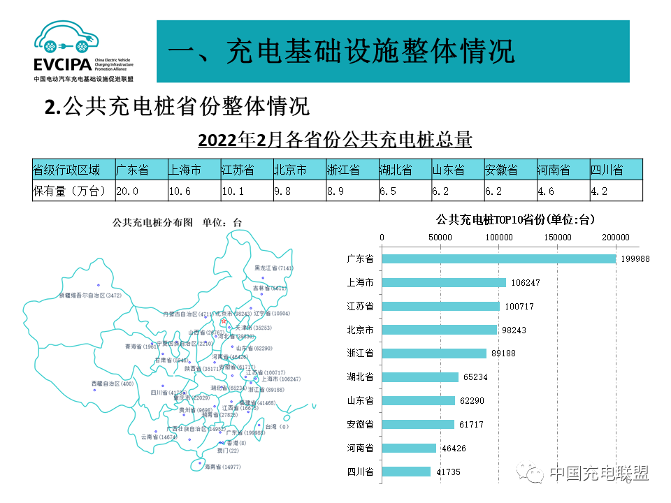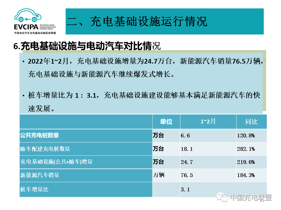 5、充电基础设施整体运行情况,2022年1~2月,充电基础设施增量为24.7万台,公共充电基础设施增量同比上涨120.8%,随车配建充电设施增量持续上升,同比上升282.1%。截止2022年2月,全国充电基础设施累计数量为286.4万台,同比增加62.9%。